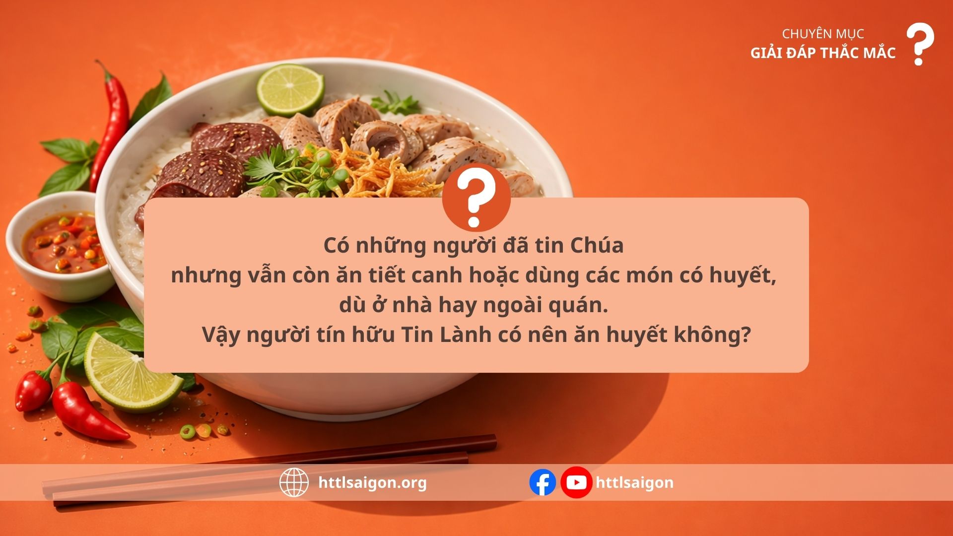 Câu hỏi: Em thấy có những người đã tin Chúa nhưng vẫn còn uống tiết canh và ăn những cục huyết trong các món ăn ở nhà và ở ngoài quán? Vậy, người tín hữu Tin Lành có nên ăn huyết không?
